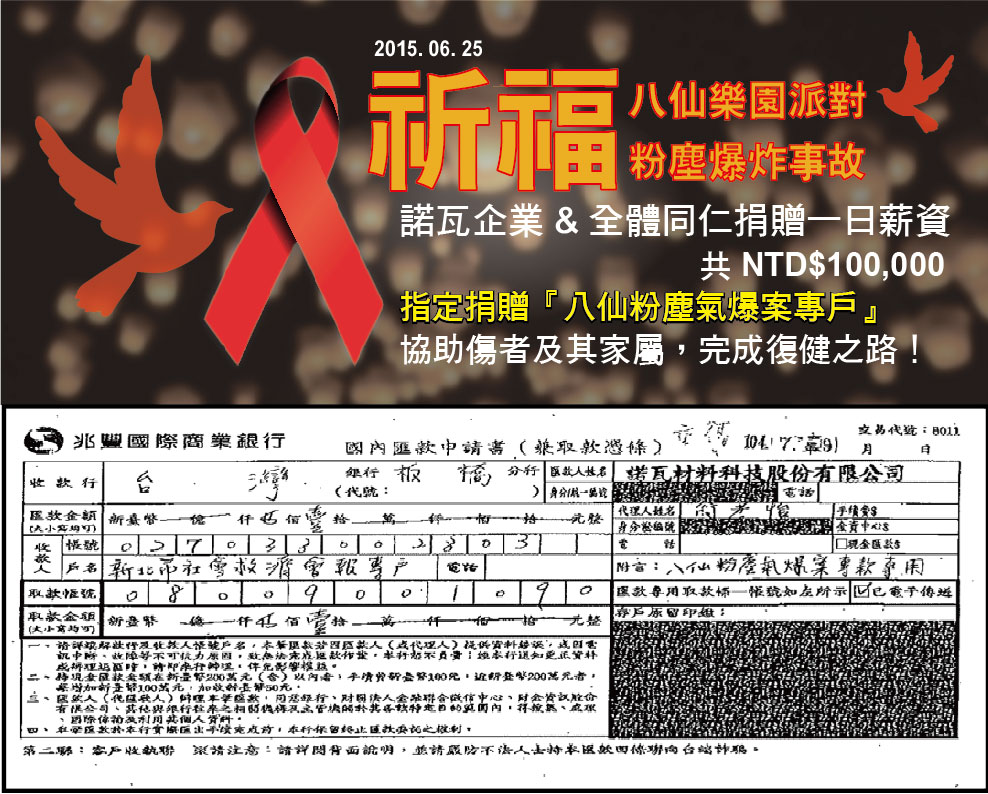 諾瓦企業及同仁(一日薪資)共同捐贈10萬元給八仙粉塵氣爆案專戶,祈福傷者,完成復健之路!