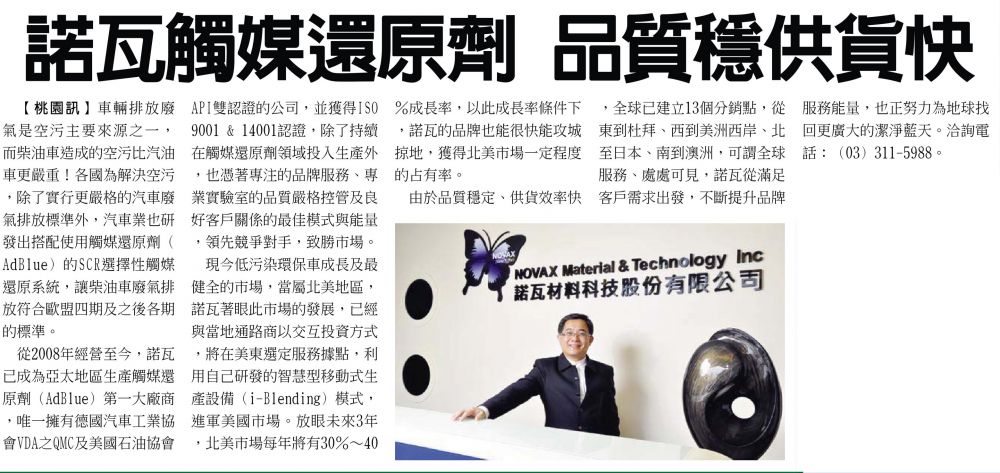 [工商時報報導] 諾瓦觸媒還原劑 品質穩供貨快
