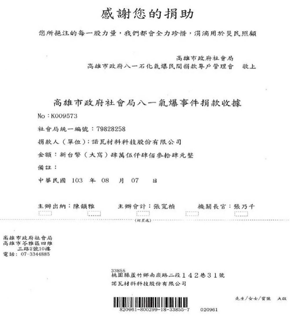 諾瓦全體同仁捐贈一日薪資,希望用於氣爆事件相關社會救助及重建,善盡企業