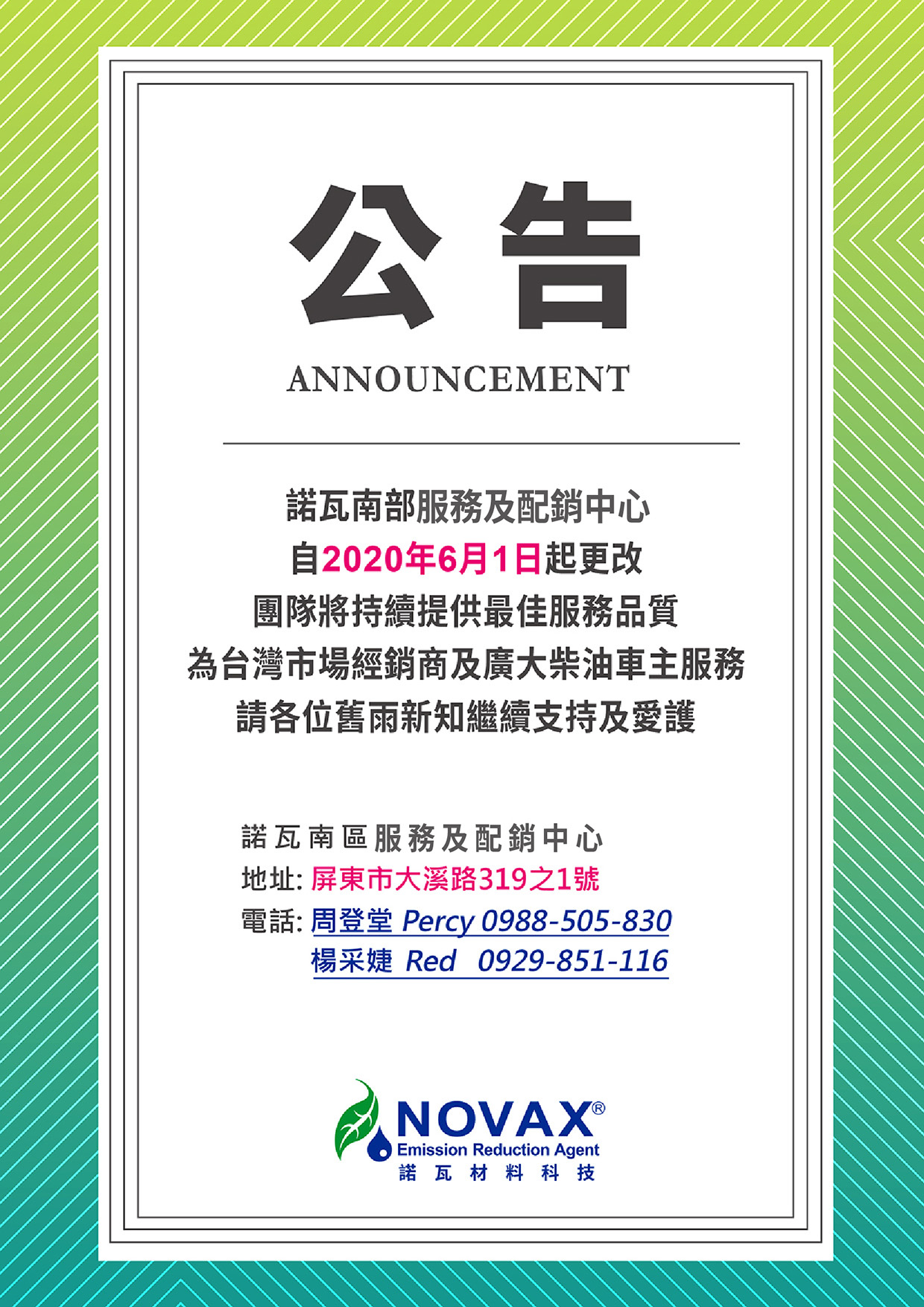 公 告:諾瓦南部服務及配銷中心 自2020年6月1日起更改