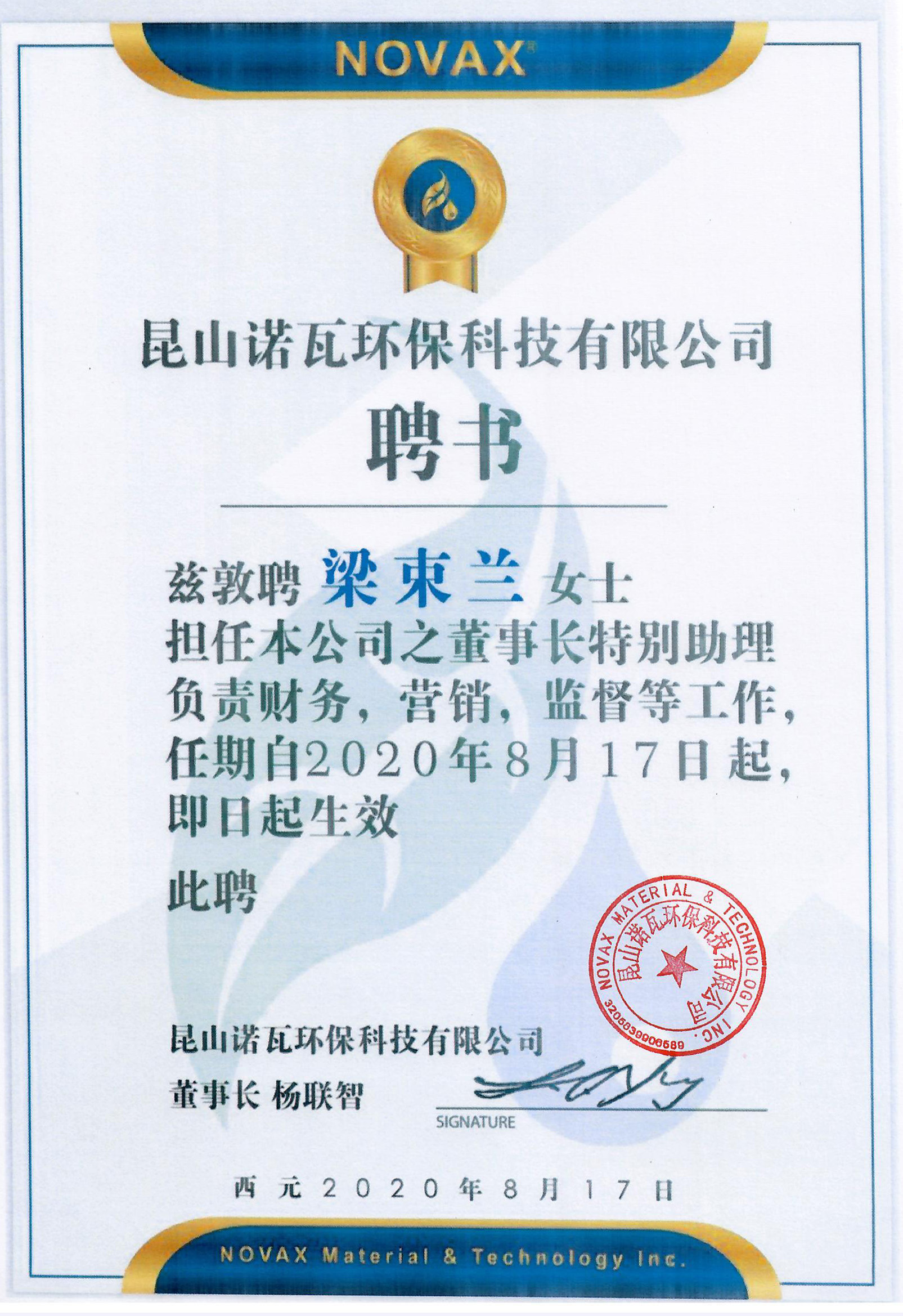 昆山诺瓦董事长特助梁束兰聘书