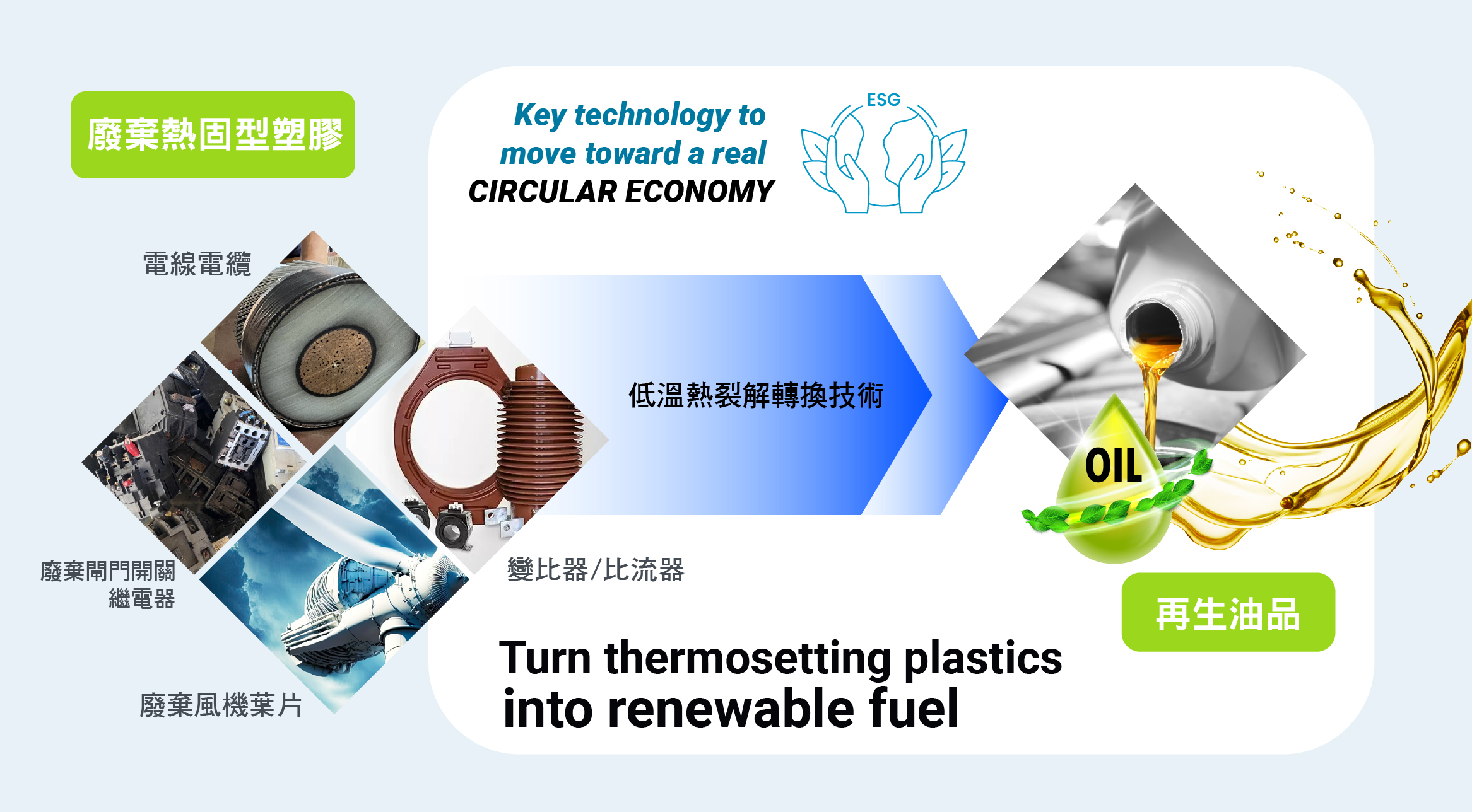 熱裂解最終產品的裂解油可作為環保燃料,提供引擎、發電機及鍋爐作為環保綠色新能源使用。
