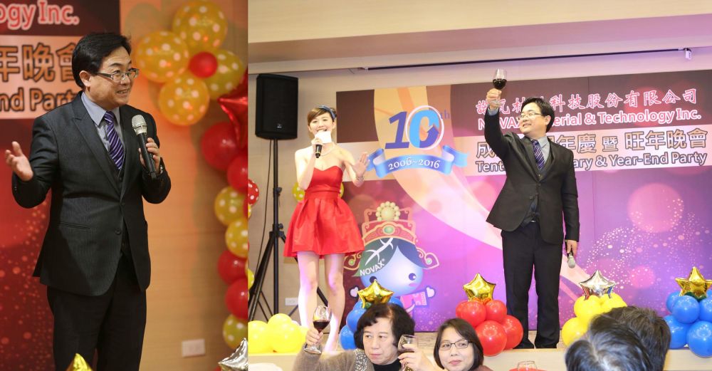 諾瓦公司29日假桃園老K舒眠文化館,盛大舉辦「成立十周年慶暨旺年晚會尾牙宴」,現場席開20桌、氣氛熱絡、賓主盡歡。董事長楊聯智先生致詞時,表示諾瓦自2006年成立開始,每年業績穩定成長,2015年整體業績仍成20%中度成長。展望2016年,雖然國際大環境不佳,原油價格持續下滑,仍樂觀預估銷售目標可達3.5億,成長35%2018年挑戰銷售目標9億新台幣,未來朝向股票公開發行、上櫃目標邁進。