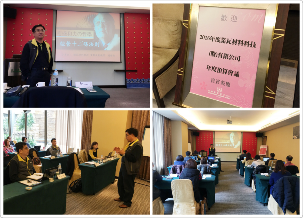 諾瓦公司之「年度預算會議」,日前在宜蘭礁溪長榮鳳凰酒店舉行。董事長楊聯智先生表示,台灣自2015年第二季後景氣愈來愈差,但量方面仍舊承現高度成長30%,但因價格下滑,營收則有10%成長,出口方面,澳洲的衰退則與香港的成長相抵,仍有20%衰退,但因綠色通道理念獲得客戶認同,國際原料貿易強勁成長250%,所以2015年整體業績仍成20%中度成長.展望2016年,雖然國際大環境不佳,原油價格持續下滑,董事長仍樂觀預估,銷售目標可達3.5.億,成長35%,未來朝向股票公開發行、上櫃目標邁進。