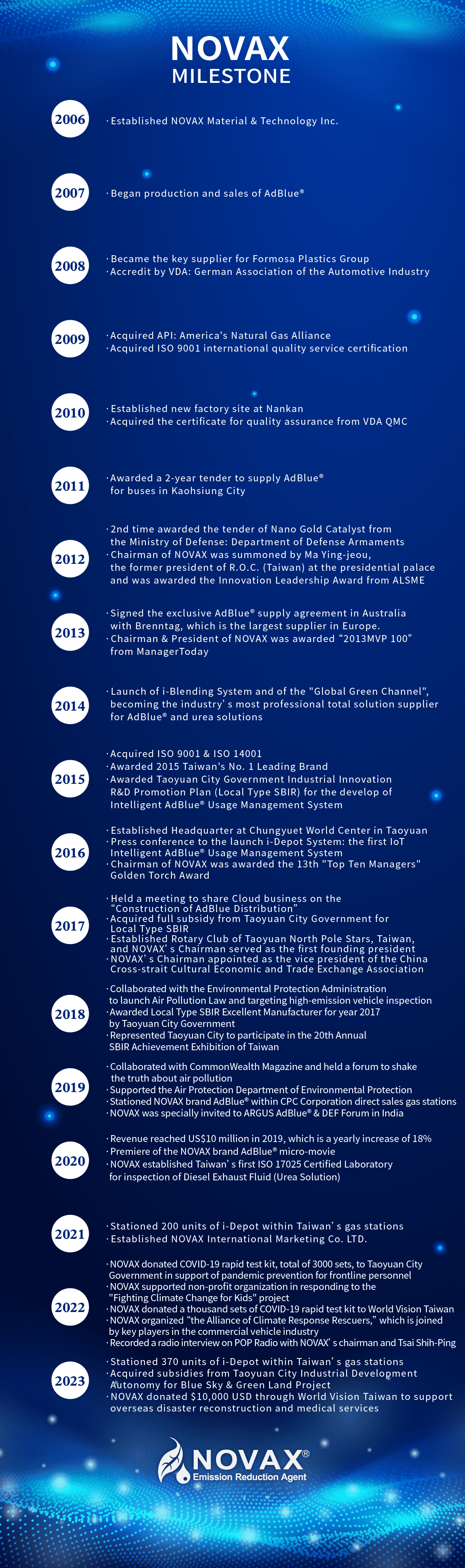 NOVAX Materials & Technology Co., Ltd. was founded by nano technology-based manufacturer in 2006, oriented to produce environmental friendly green products. NOVAX's AdBlue® (vehicle urea solution) is went through an ultra-filtration system to upgrade our product quality with more stable performance per long-term monitoring. Our specification is strictly based on DIN 70070 / ISO 22241 standard, and our own professional lab is always working multi-verification with various 3rd-party laboratory such as SGS of Germany, Australia, Hongkong, China, and Taiwan. NOVAX® is also the unique pioneer in the industry in Taiwan who obtained dual accreditation from both the United States and Germany.